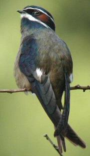 The tree swifts or crested swifts are aerial near passerine birds, closely related to the true swifts. They are restricted to southeast Asia and Australasia. They differ from the other swifts in that they have crests, long forked tails and softer plumage. The males have iridescent mantle plumage. These are birds of open woodland which, like all swifts, have life styles based on catching insects in flight. They lay one grey egg in the nest, which is glued to an open tree branch. |